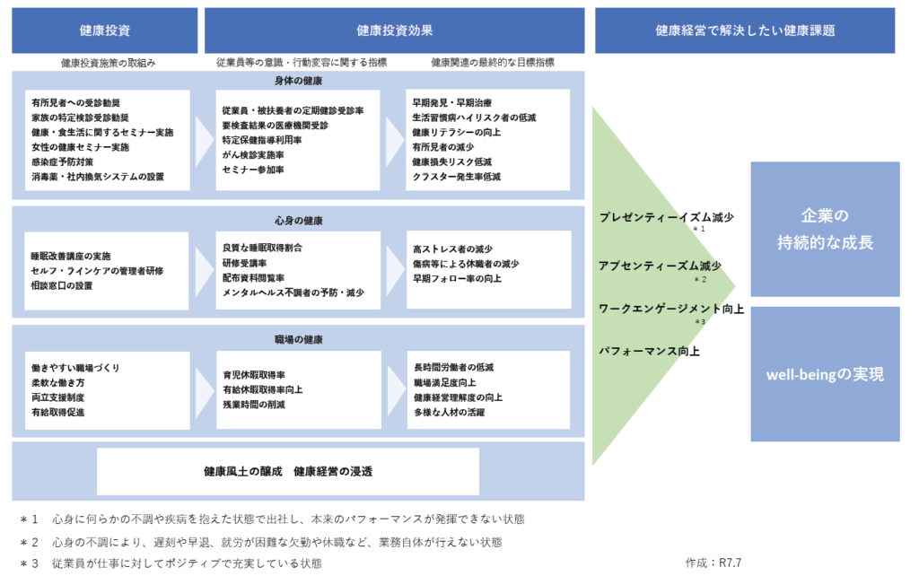 健康経営で解決したい経営上の課題・健康投資の内容・効果を戦略マップで明確にしています。