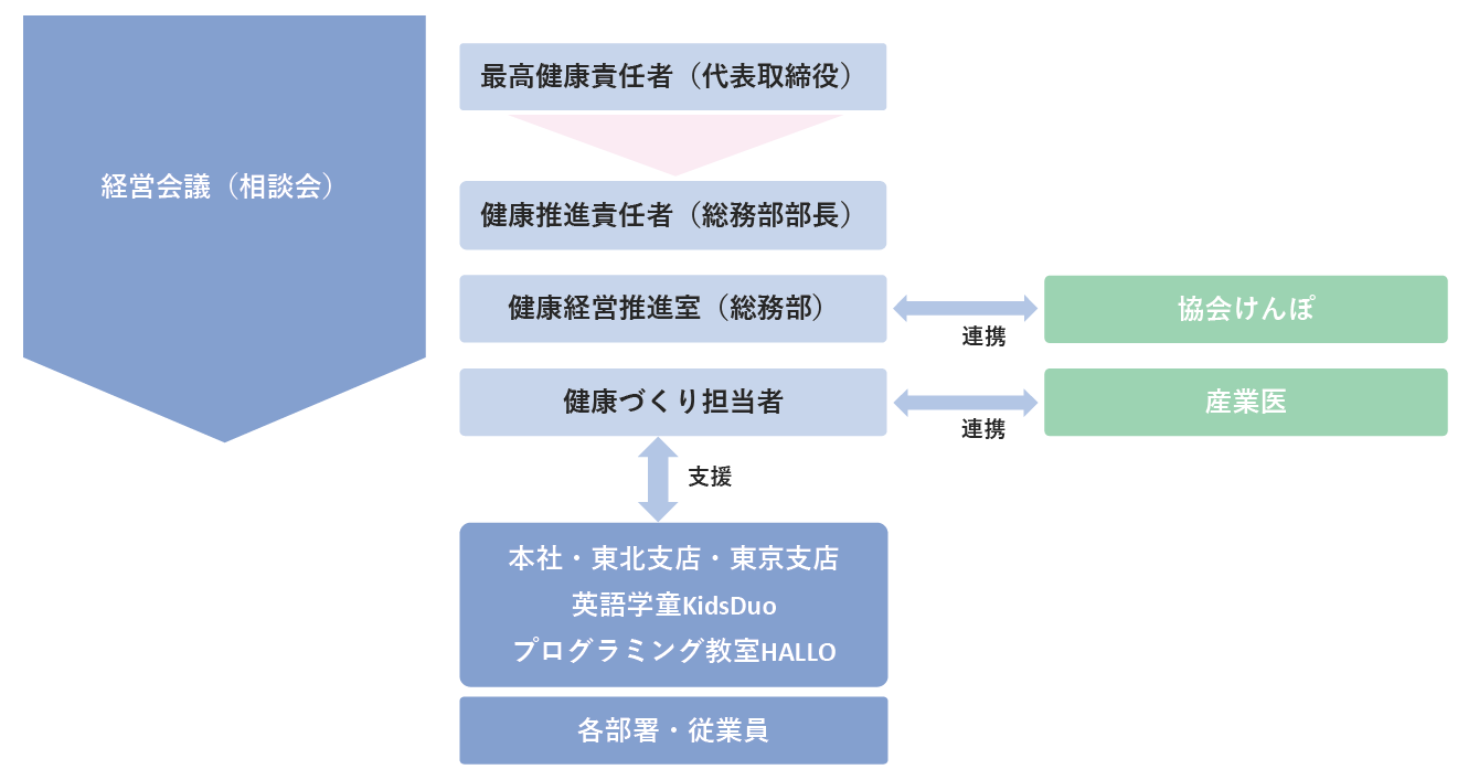- 当社の経営理念に掲げている「働きがいのある場を作り意欲と能力を重んじ活力のある集団をめざす。」を実現するためには、健康を経営課題としてとらえ、ひとりひとりの生産性を向上させることが重要であると考えます。