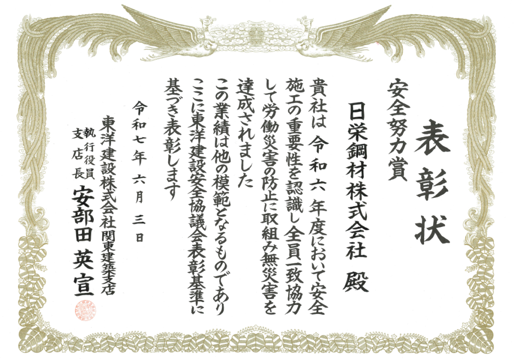 NEWS 2025.06.04 東洋建設株式会社様より表彰されました 東洋建設株式会社関東建築支店様より「安全努力賞」を受賞しました。 弊社一同、この度の受賞を励みとして、さらなる安全衛生に努めた職場環境を整えてまいります。