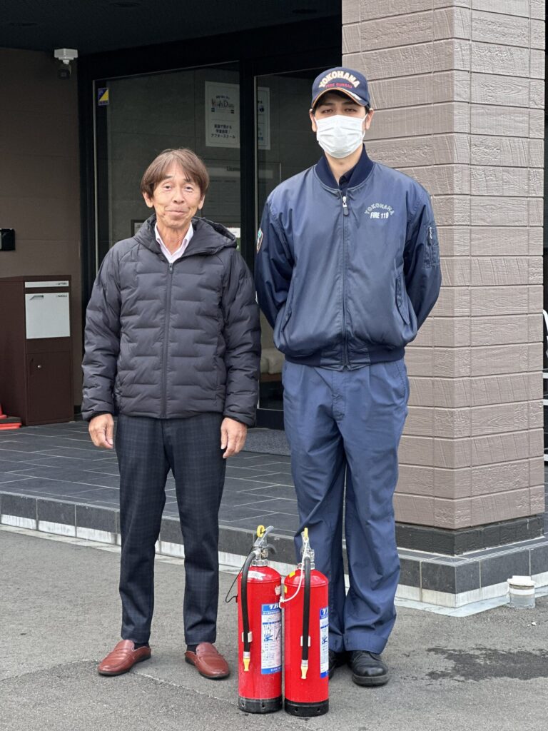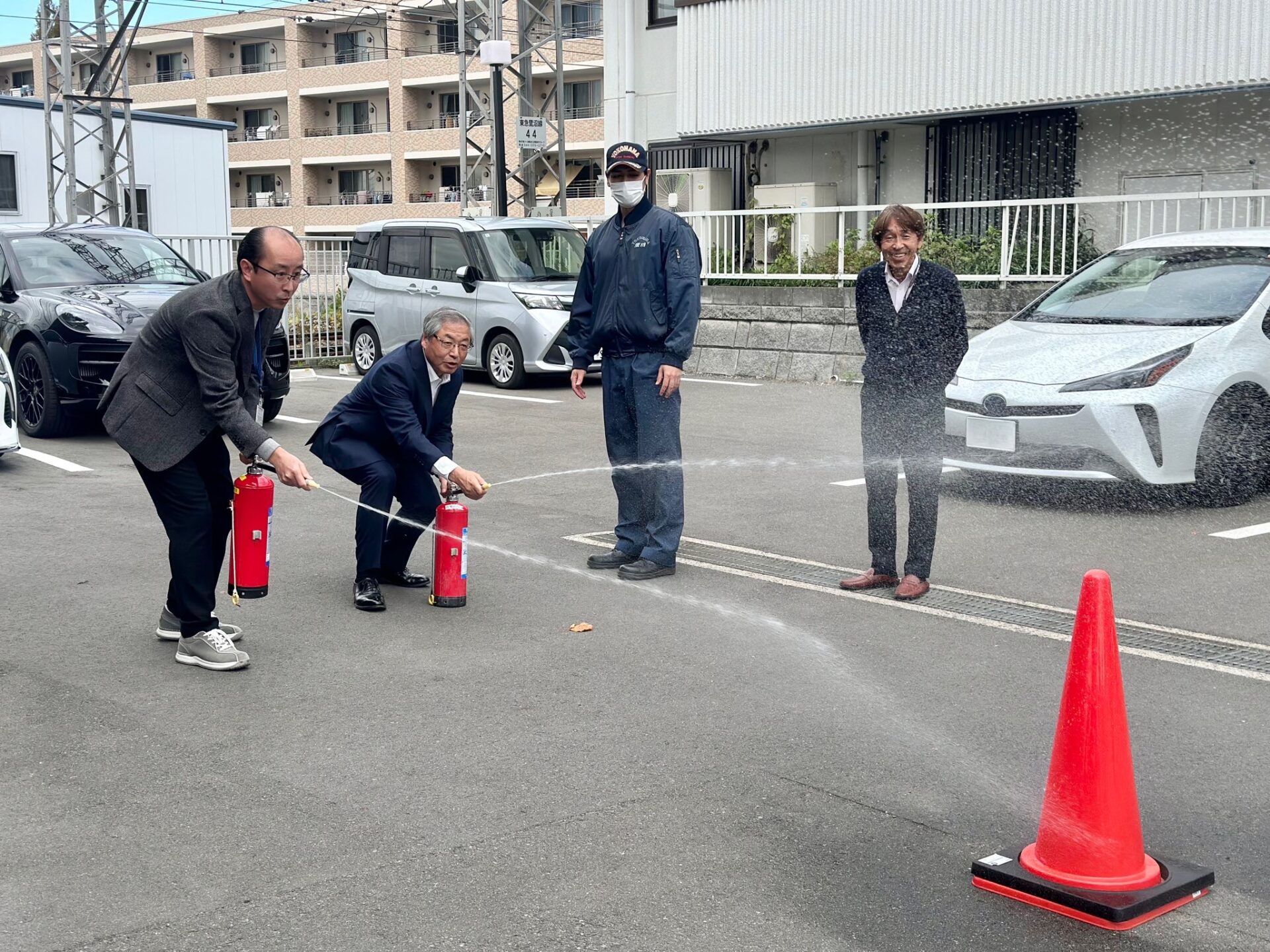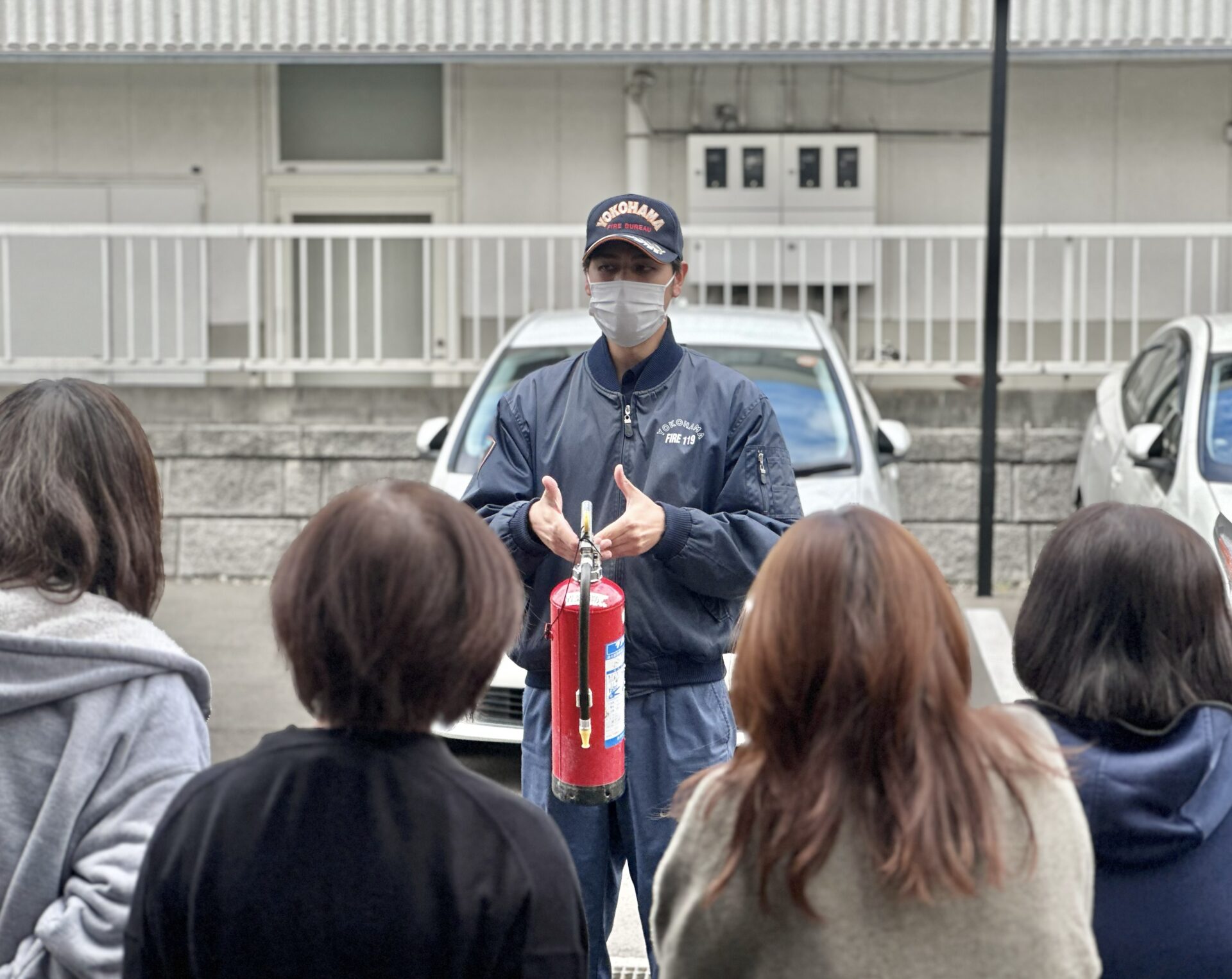 荏田消防署の消防士の方のご指導のもと、避難経路の確認、通報の仕方、消火器の使用方法など、実際の状況を想定した訓練を行い、非常時における行動を再確認しました。