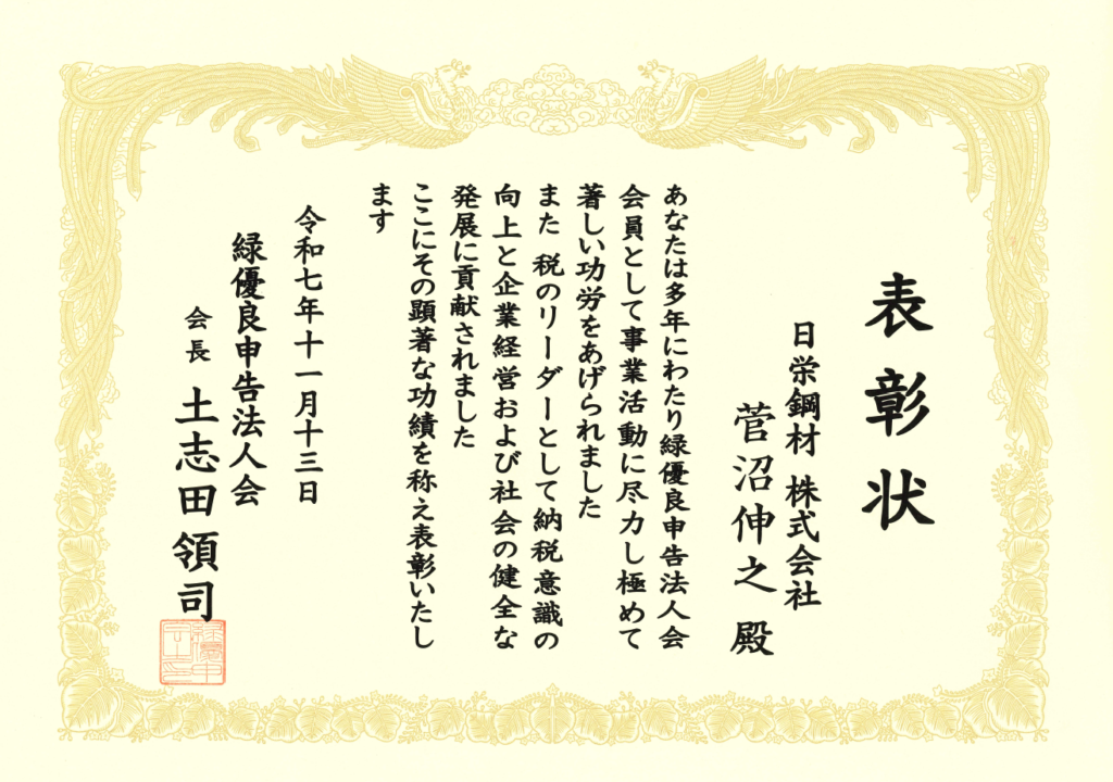 このたび当社は、優良申告法人会会員として事業活動に尽力し、著しい功労を挙げたこと、並びに税のリーダーとして納税意識の向上および企業経営ならびに社会の健全な発展に寄与したことが高く評価され、表彰を賜りました。